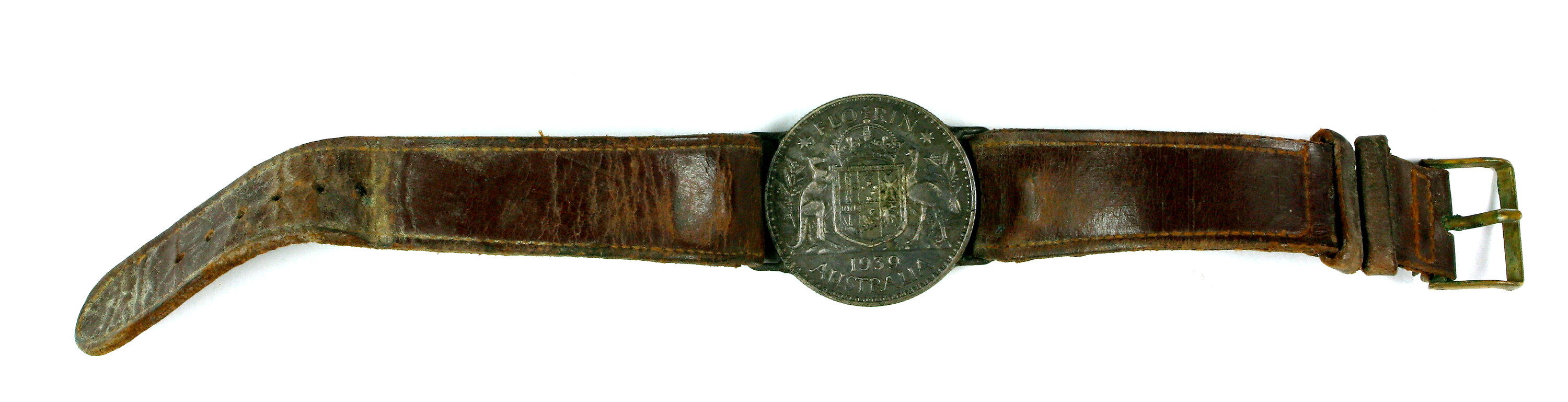 A 1939 Florin coin has had handles attached to left and right sides. To these have been attached the brown leather straps of a watch band. Brass buckle on strap has verdigris.