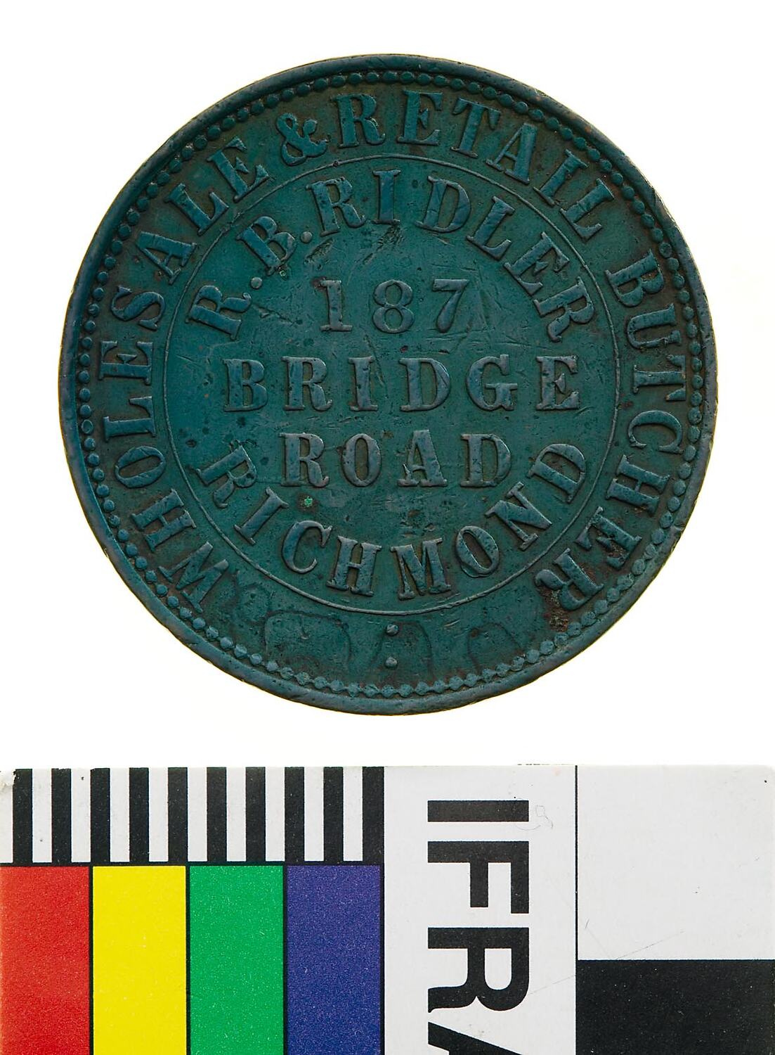 Copper One Penny Token, minted by Thomas Stokes, Melbourne. Originally issued by R.B. Ridler, Wholesale & Retail Butcher, Richmond, Victoria, 1862. Robert Broom Ridler was an Englishman, born in Devonshire in 1825. He arrived in Victoria in about 1852. He took a position as salesman with Mr. Butler in the shop which shortly afterwards became his own, in Richmond. By 1856 Ridler was running the shop in his own name. In 1857 Ridler married Sophia Wild, later having eleven children. He sold his business to a Mr Brockman in 1877 and retired to Dandenong, where he died in 1898.