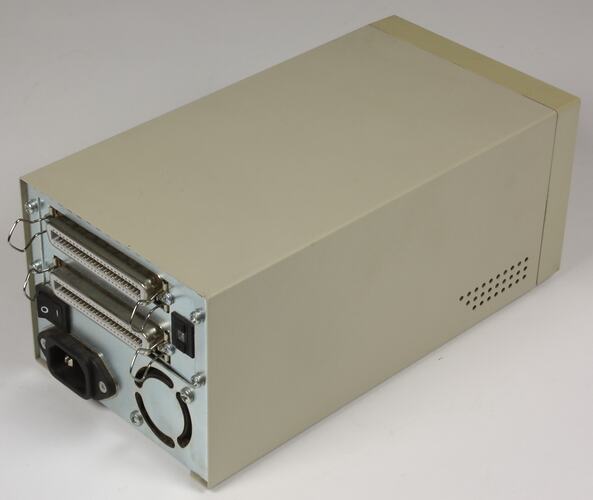 Rectangular box-type computer drive. Beige coloured. Door on front for inserting computer disk. Three connection points at rear of drive.