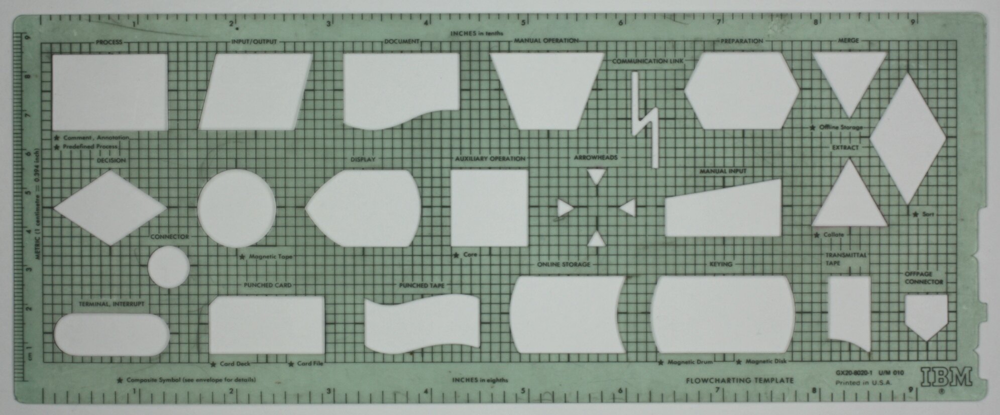 'FLOWING CHART TEMPLATE/ GX20-8020-1 U/M 010/ PRINTED IN THE U.S.A./ IBM' 'INCHES in eighths' 'Composite Symbol (see envelope for details)'