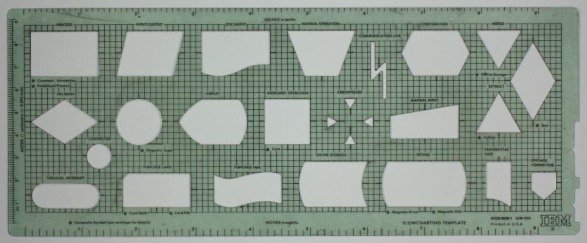 This was used by the donor as an indispensable tool for flowcharting programs when programming for IBM computers. Template includes such options as 'magnetic tape', 'manual input', 'transmittal tape' and 'punched tape'. Donor worked as a programmer for the company that provided Friden equipment in Australia.