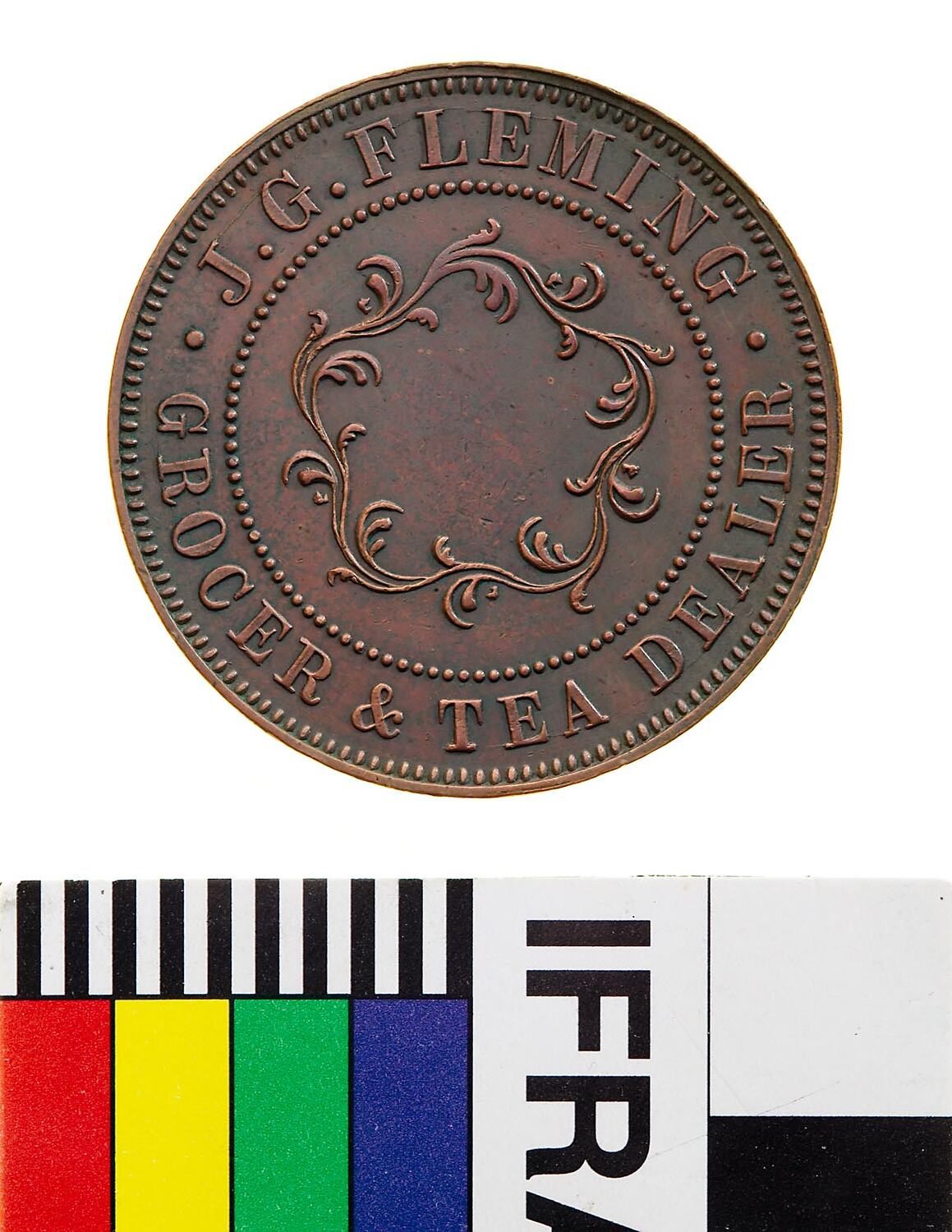 A round bronze token (31 mm diameter). The token features the name, address and business of the issuer: J.G. Fleming, Sugar Loaf, Hobart Town, grocer & tea dealer. The obverse features a circular scroll work and the reverse a sugar loaf stamped F.