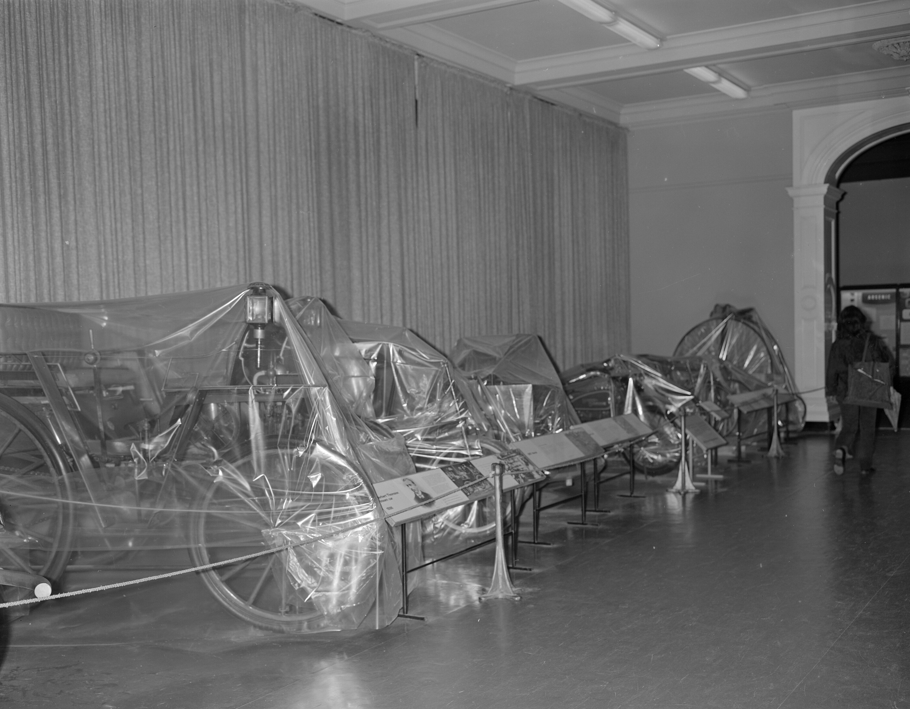 Negative copy of photograph showing the covered transport exhibits in Verdon Hall during stairway construction, circa1970.Verdon Hall displayed the Science Museum's Cobb & Co. collection, as well as cars, bicycles and motor bicycles.