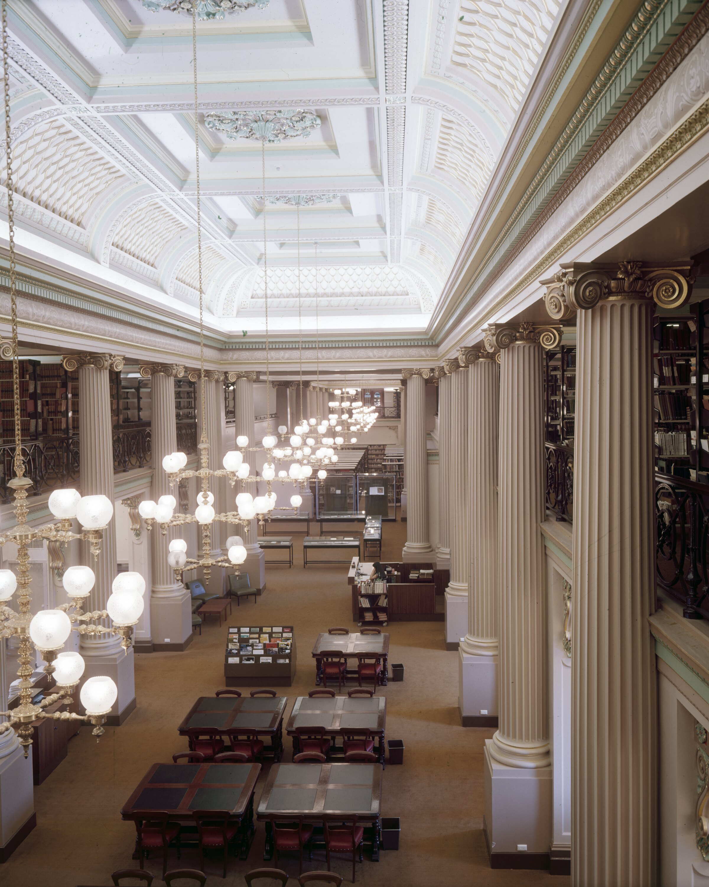 Copy of photographic negative showing view of Queen's Hall from overhead balcony, circa 1969. Until 1968, Queen's Hall had been used to display the bulk of the Institute of Applied Science's (Science Museum) exhibits. After Queen's Hall was transferred to the State Library of Victoria in 1968, the Institute's displays moved to McArthur Hall and the South Rotunda, Swinburne Hall and John Monash Hall.
