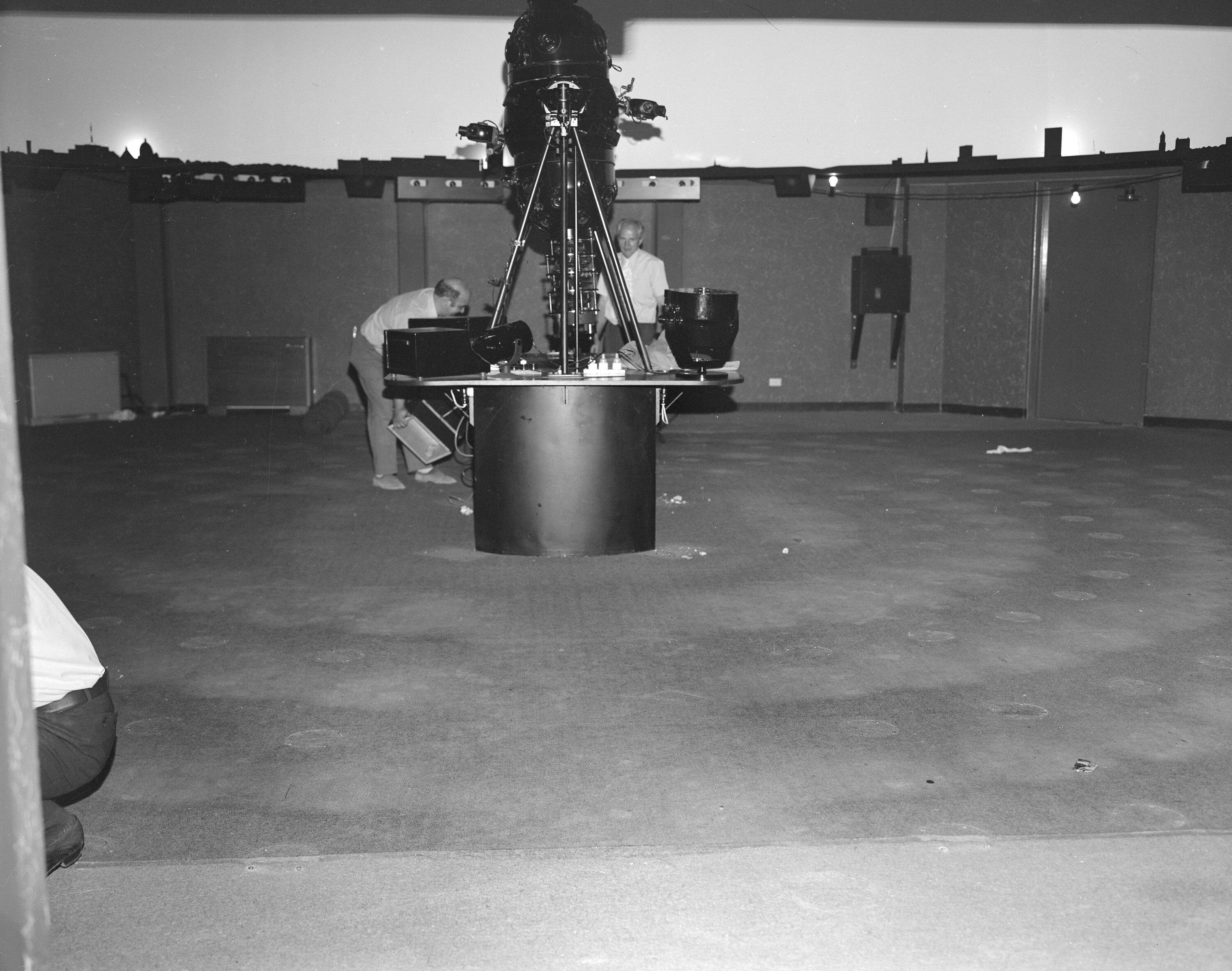 Copy of photographic negative depicting a group of men recarpeting the H. V. McKay Planetarium at the Science Museum, 1975. The Planetarium operated at the Swanston Street building from 1965 to 1997, before it was replaced by the Melbourne Planetarium at Scienceworks in 1999.