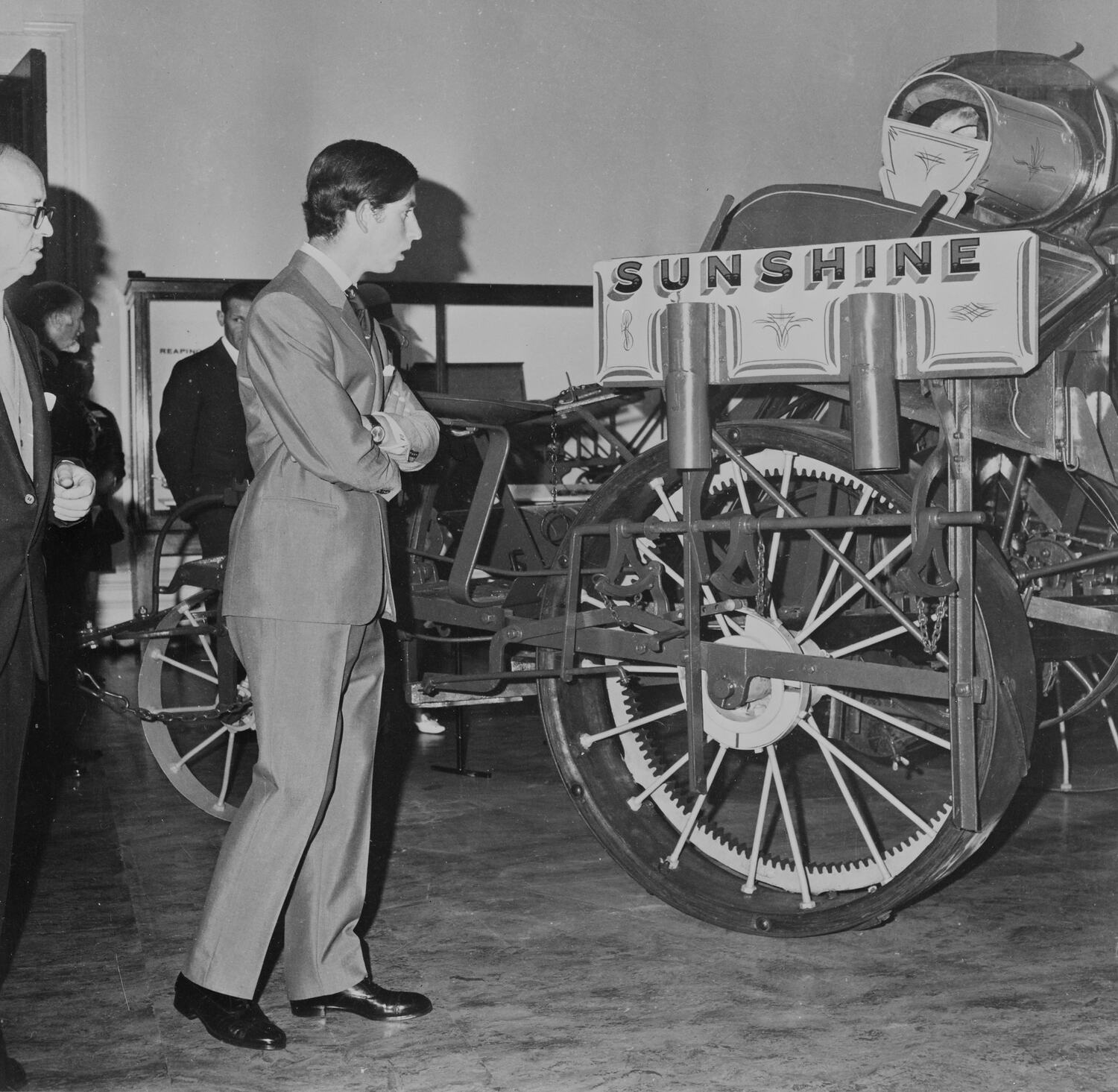 Negative copy of photograph depicting Prince Charles viewing the McKay Harvester in the agricultural displays in Swinburne Hall at the Science Museum, 1970. The Royal Tour of 1970 coincided with the Science Museum's centenary celebrations.
