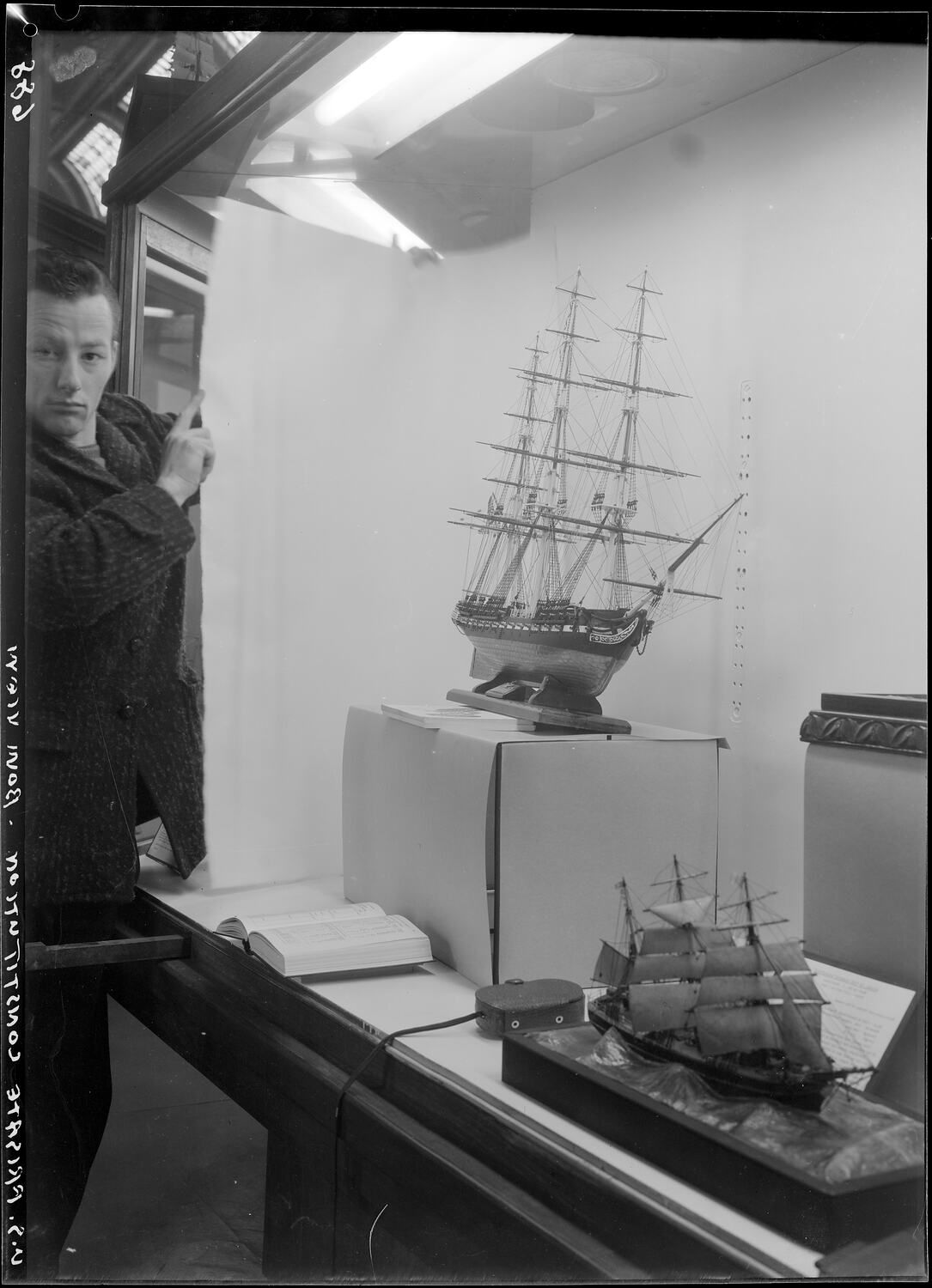 Photographic negative depicting a model of the U.S.S. Constitution (ST 023329) on display at the Institute of Applied Science (Science Museum), in the 1960s. The Constitution was launched in 1797 in Boston, and served against the British navy in the early 19th century. This model was created c. 1960.