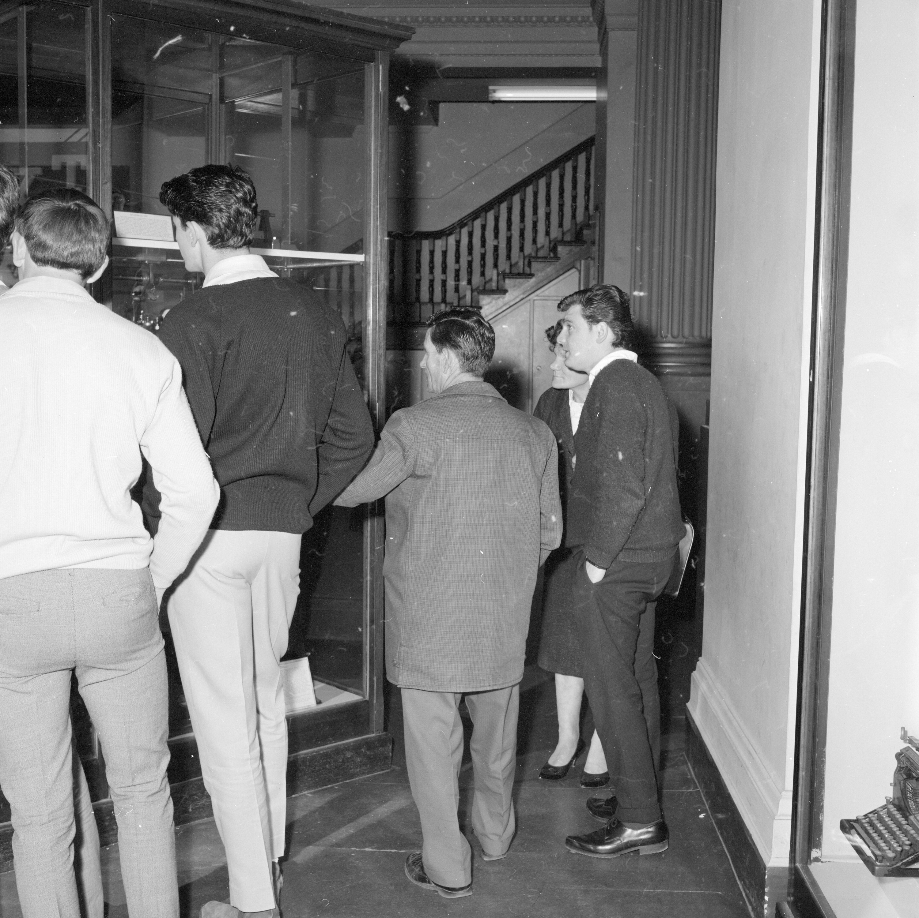Photographic negative depicting a tour group in Queen's Hall at the Institute of Applied Science (Science Museum), circa 1960s. Until 1968, Queen's Hall was the Institute's primary display area.