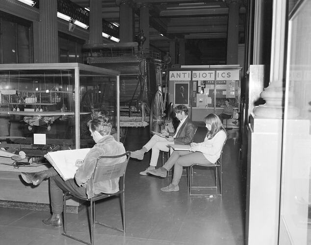 Copy of photographic negative showing a group of art students from the Royal Melbourne Institute of Technology (R.M.I.T.) sketching in Queen's Hall at the Institute of Applied Science (Science Museum), 1968. Before the Institute lost this space in 1968, Queen's Hall covered a wide range of industrial and scientific topics, including the aviation and antibiotics display visible in this photograph.