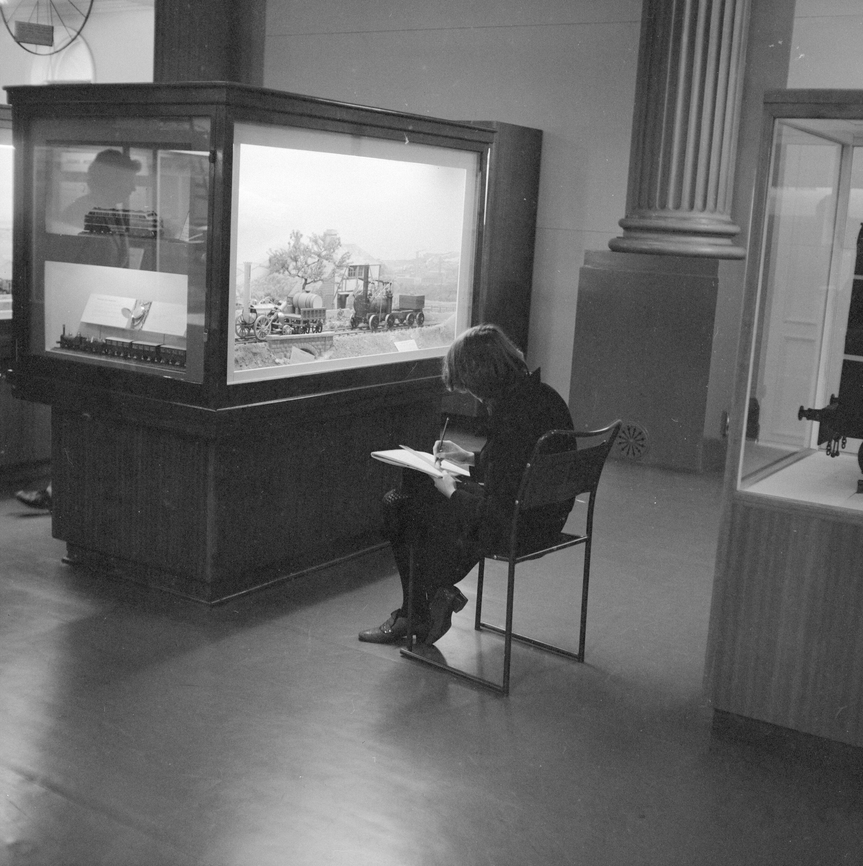 Copy of photographic negative showing an art student from the Royal Melbourne Institute of Technology (R.M.I.T.) sketching in Queen's Hall at the Institute of Applied Science (Science Museum), 1968. Many of the Institute's displays were held here in Queen's Hall and its balconies until the space was transferred to the State Library of Victoria.