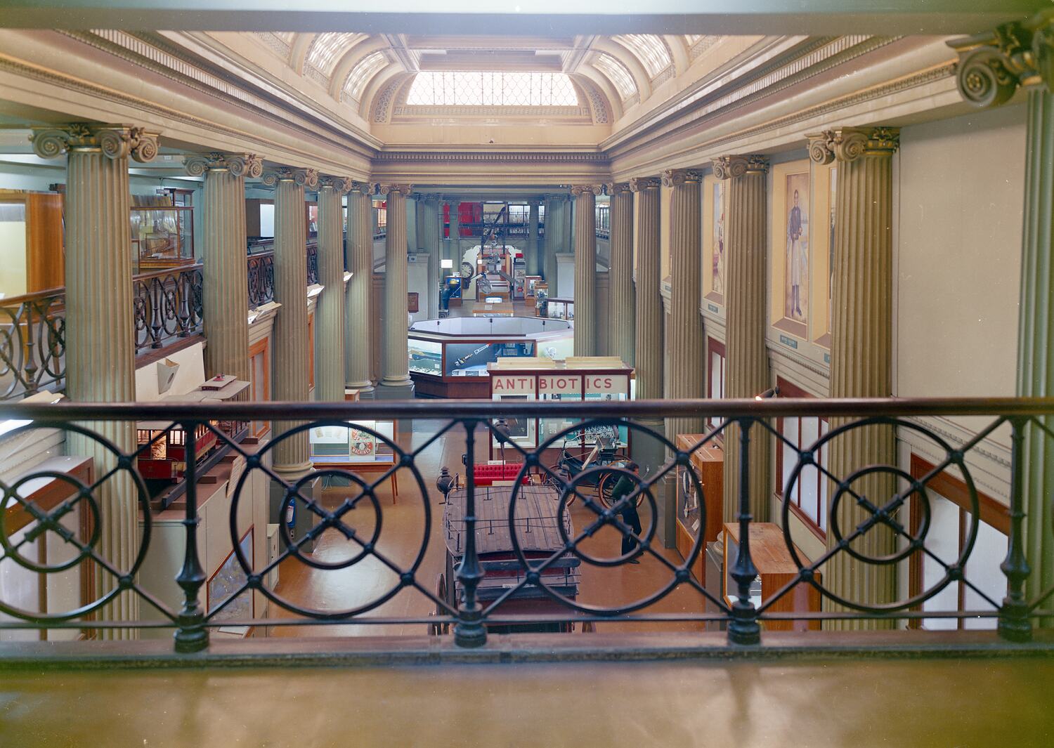 Copy of photograph negative showing view of Queen's Hall at the Institute of Applied Science (Science Museum) in 1968. Prior to 1968, the majority of the Institute's displays were held in Queen's Hall and its overlooking balconies. Exhibition topics included shipping, aviatiion, photography, antibiotics, primary production, bacteriology, road and rail transport and optics. During this year Queen's Hall was taken over by the State Library of Victoria, and the Institute was granted display space in McArthur Hall, Monash Hall and Swinburne Hall.