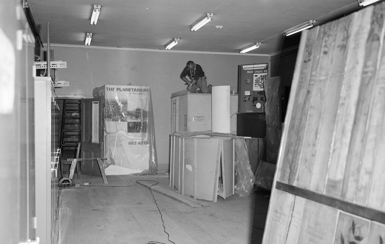 Man Dismantling Cabinets in Storage Area. Timber Samples in Foreground and Planetarium Signage in Background.
