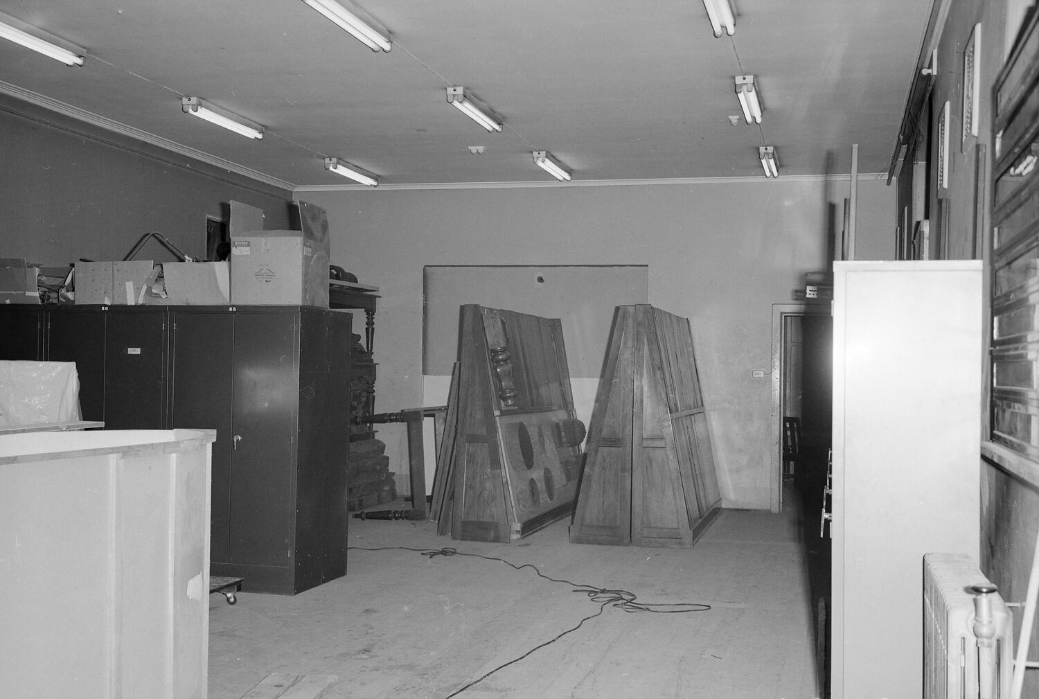 Copy of photographic negative depicting temporary storage area during works at the Science Museum, Swanston Street, Melbourne, 1973.
