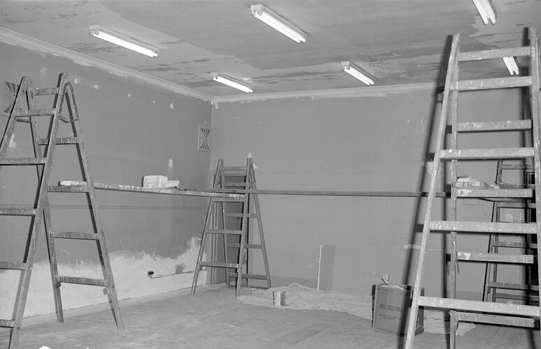 Museum History, Work, Tradespeople, Renovations, Repairs & Maintenance, Painting & Decorating, Painting & Decorating Equipment, Ladders, Electric Lighting, Electric Lights, Fluorescent Lighting Tubes, Fluorescent Lighting, Museum Redevelopment
