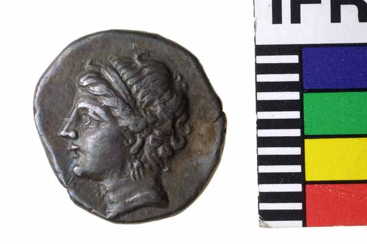 Head of nymph facing left, hair bound with diadem and wearing necklace and earing.