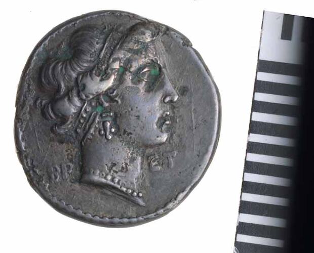 Head of nymph facing right, hai bound with diadem and wearing necklace and earing. Behind neck in Greek BR and in front ET.
