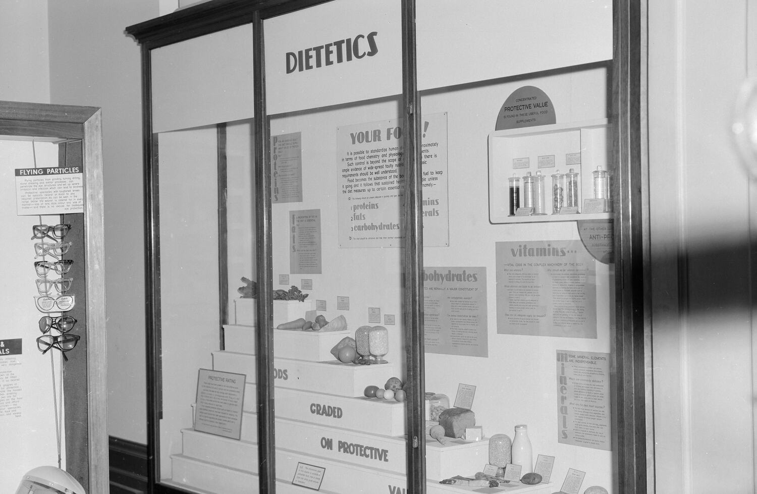 Copy of photograph negative depicting the dietetics display, next to the optics display, in Queen's Hall at the Institute of Applied Science (Science Museum) in 1967.