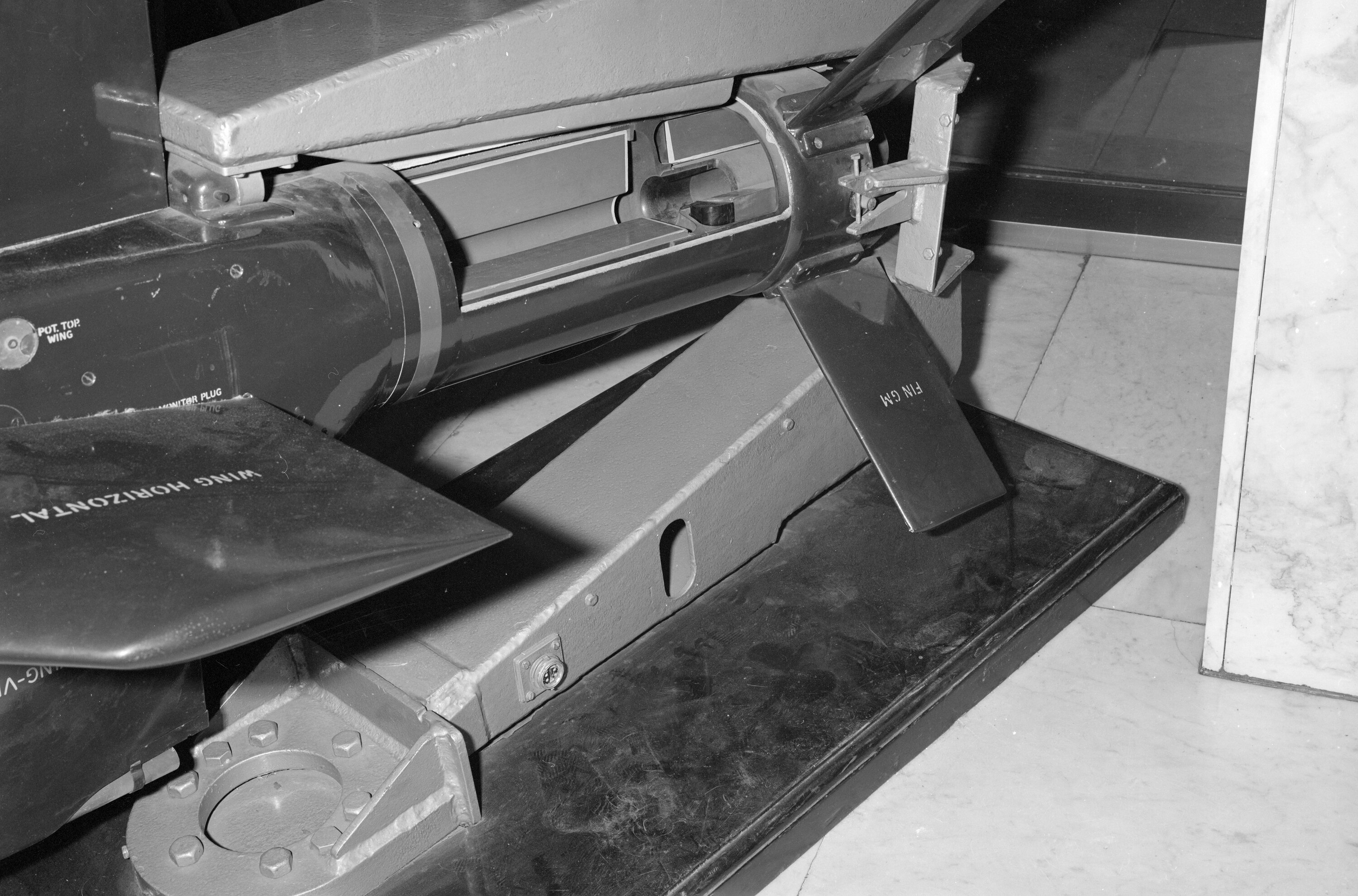 Photographic negative of scale model of the target drone G.A.F. 'Jindivik' (ST 24761) at the entrance to the Science Museum in 1972. This 1:12 scale model was purchased by the Museum in 1960 from the Government Aircraft Factories.