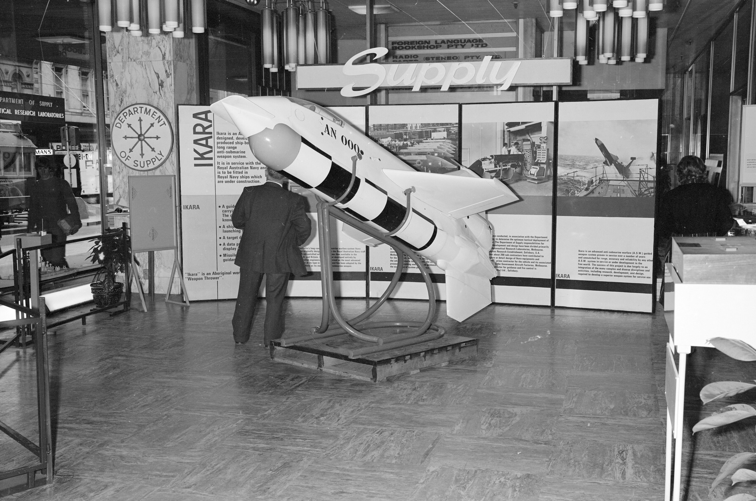 Photographic negative of the 'Ikara' missile display in the ground foyer of the Science Museum, 1972. The Ikara was an anti-submarine missile, developed by the Australian Government Aircraft Factories.