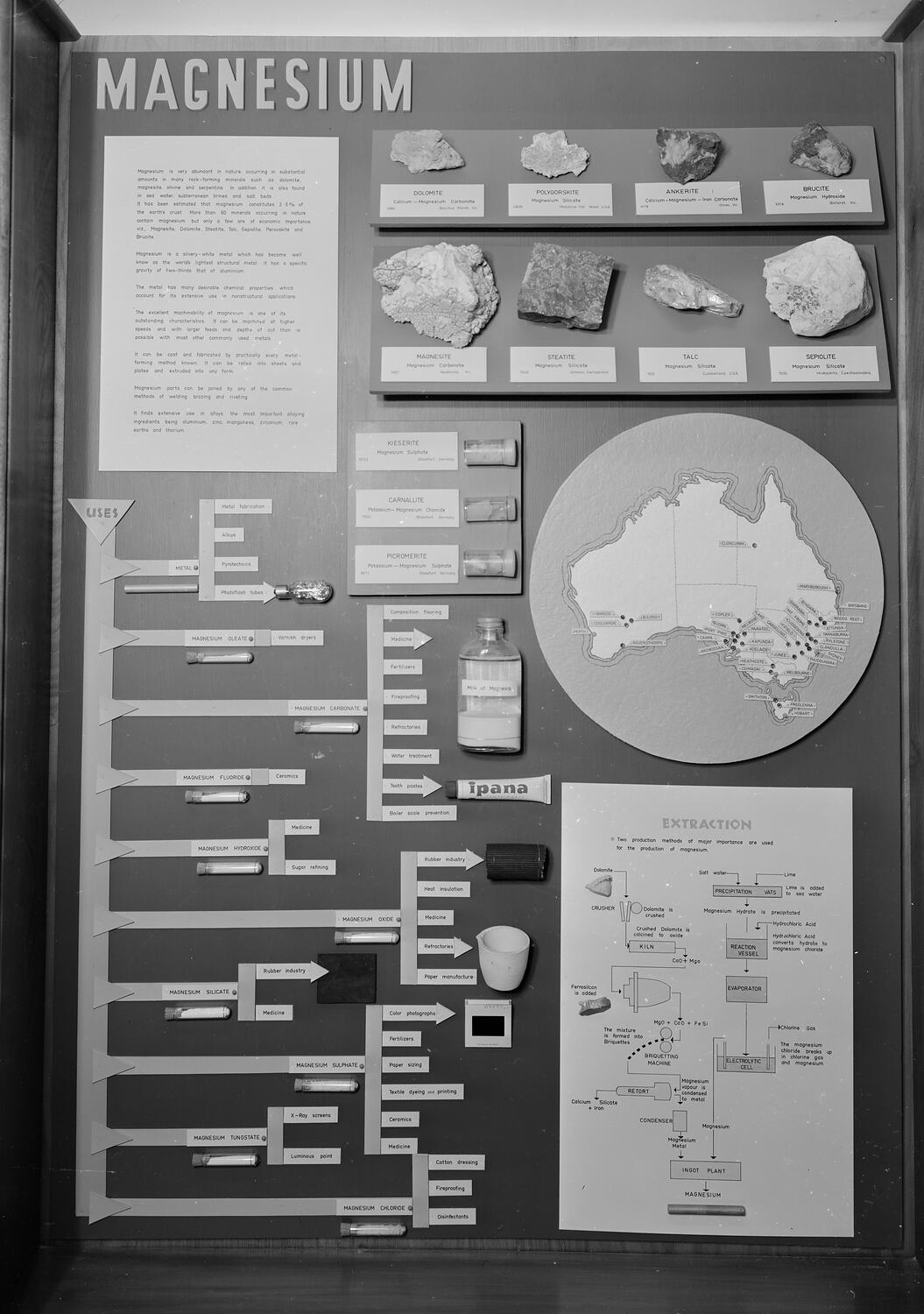 Negative copy of photograph showing the magnesium display in Queen's Hall at the Institute of Applied Science (Science Museum), Melbourne, 1960s. This display was part of a larger exhibition on economic minerals found in Australia.