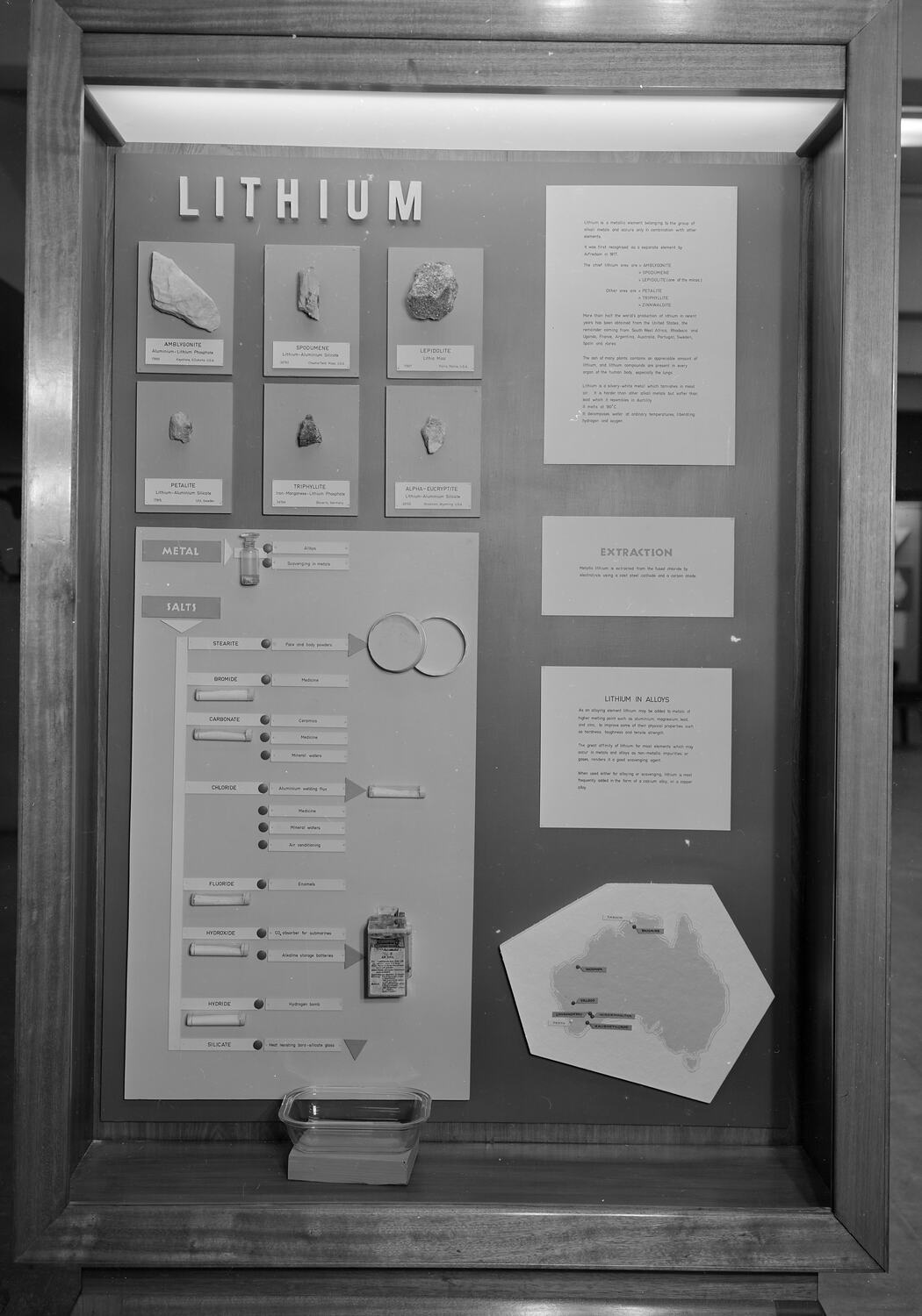 Negative copy of photograph depicting the lithium display in Queen's Hall at the Institute of Applied Science (Science Museum), in the 1960s. This display was part of a larger exhibition on economic minerals found in Australia.