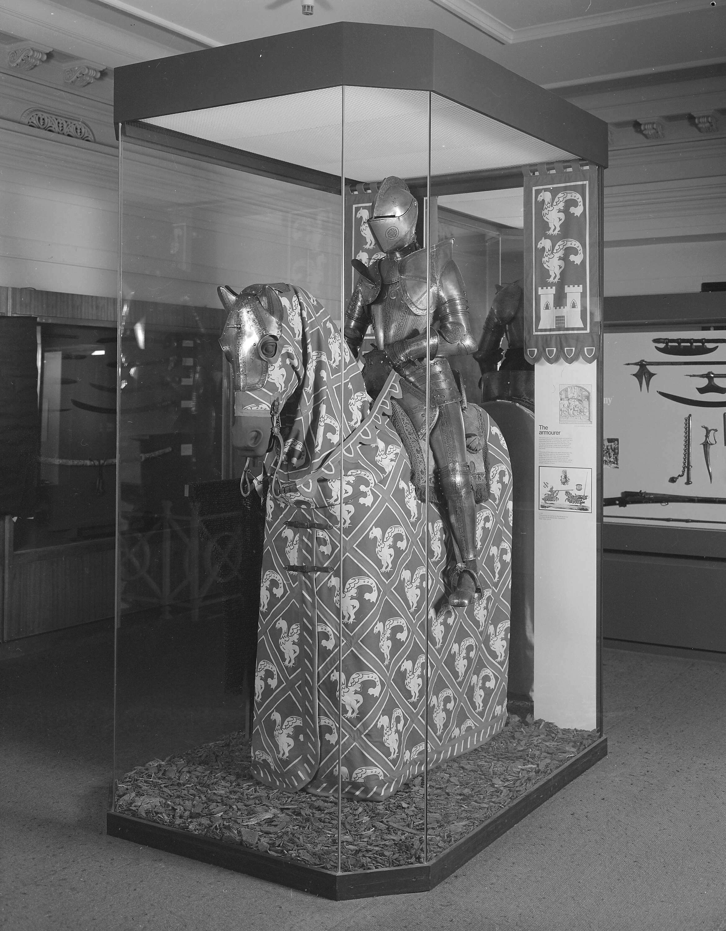 Photographic negative showing display of an Italian knight on horseback at the Institute of Applied Science (Science Museum), in the 1960s. This model was displayed with the Museum's extensive weapons collection in Barry Gallery.