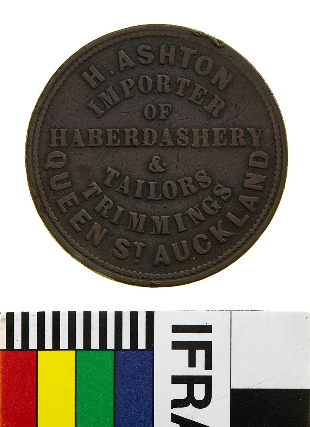 Obverse: H.ASHTON/IMPORTER/OF/HABERDASHERY/&/TAILORS/ TRIMMINGS/QUEEN ST. AUCKLAND Reverse: NEW ZEALAND 1862