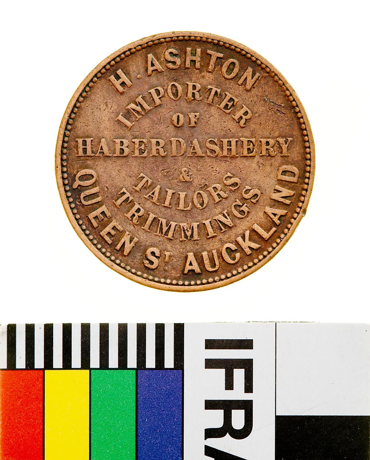 Obverse: H.ASHTON/IMPORTER/OF/HABERDASHERY/&/TAILORS/ TRIMMINGS/QUEEN ST. AUCKLAND Reverse: NEW ZEALAND 1858
