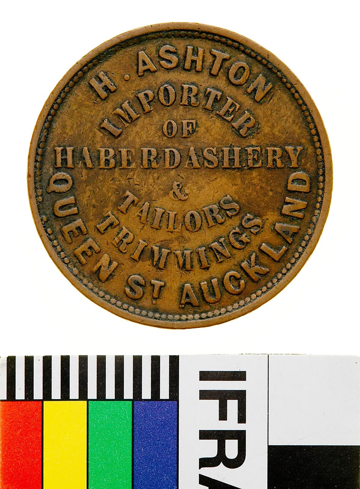 Obverse: H.ASHTON IMPORTER OF HABERDASHERY & TAILORS TRIMMINGS QUEEN ST. AUCKLAND Reverse: NEW ZEALAND 1863