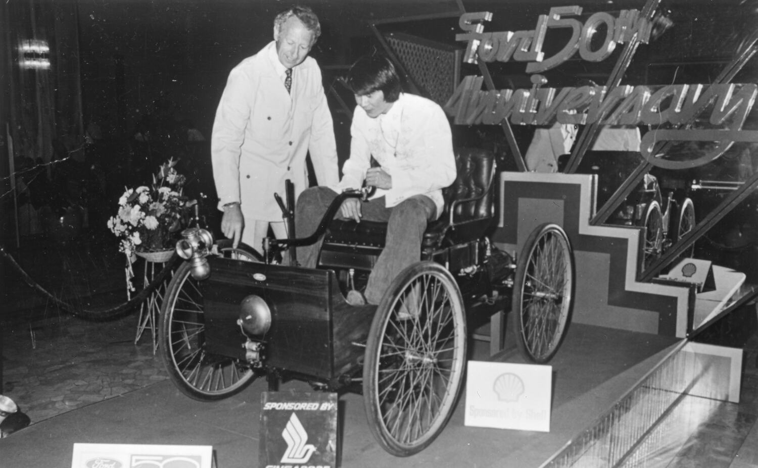 Copy of photographic negative showing two visitors with an original 1896 Ford quadricycle at the Institute of Applied Science (Science Museum), circa 1969.