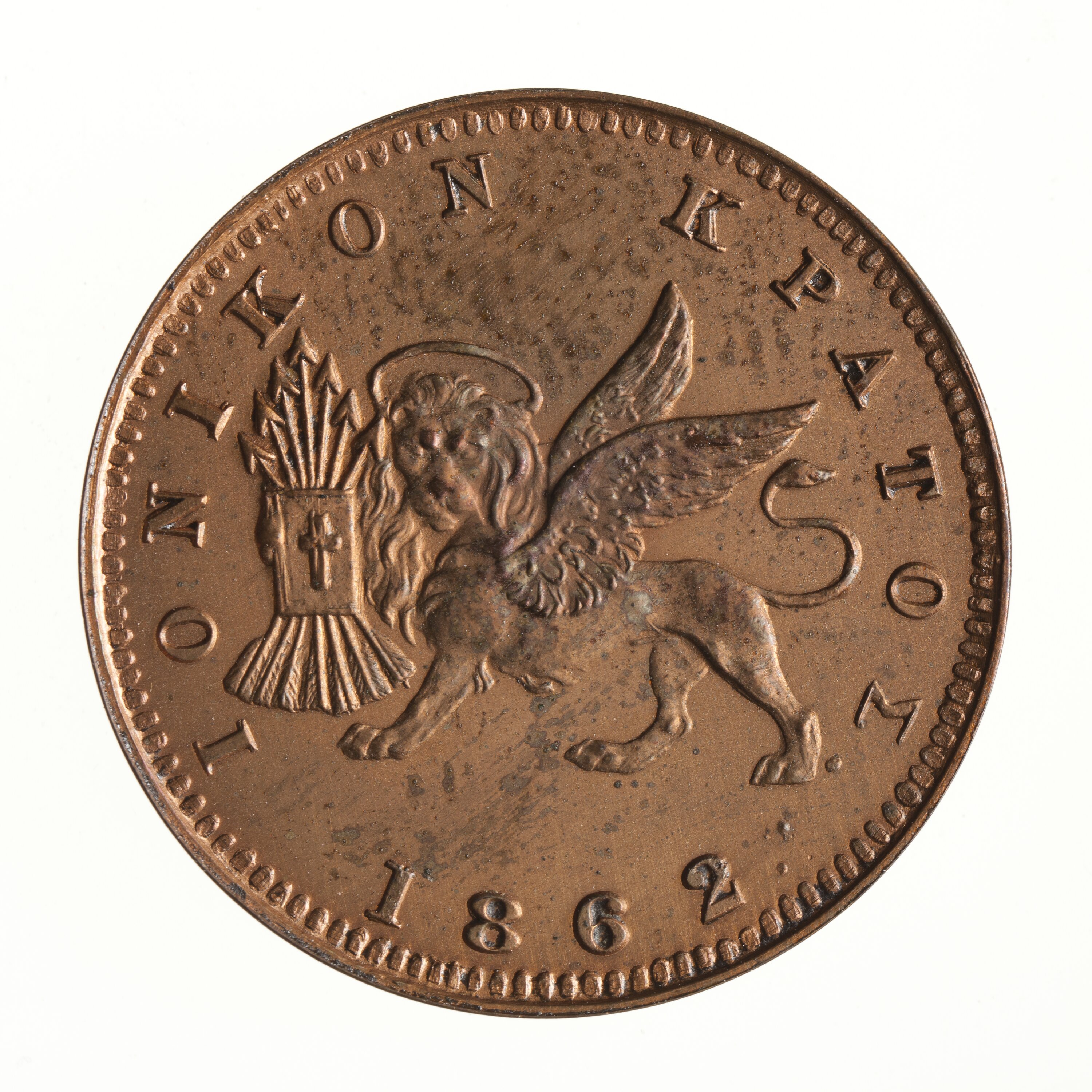 Winged lion of St. Mark facing to left holding Bible and seven arrows; below, 1862.; around above in Greek, IONIKON KPATOS