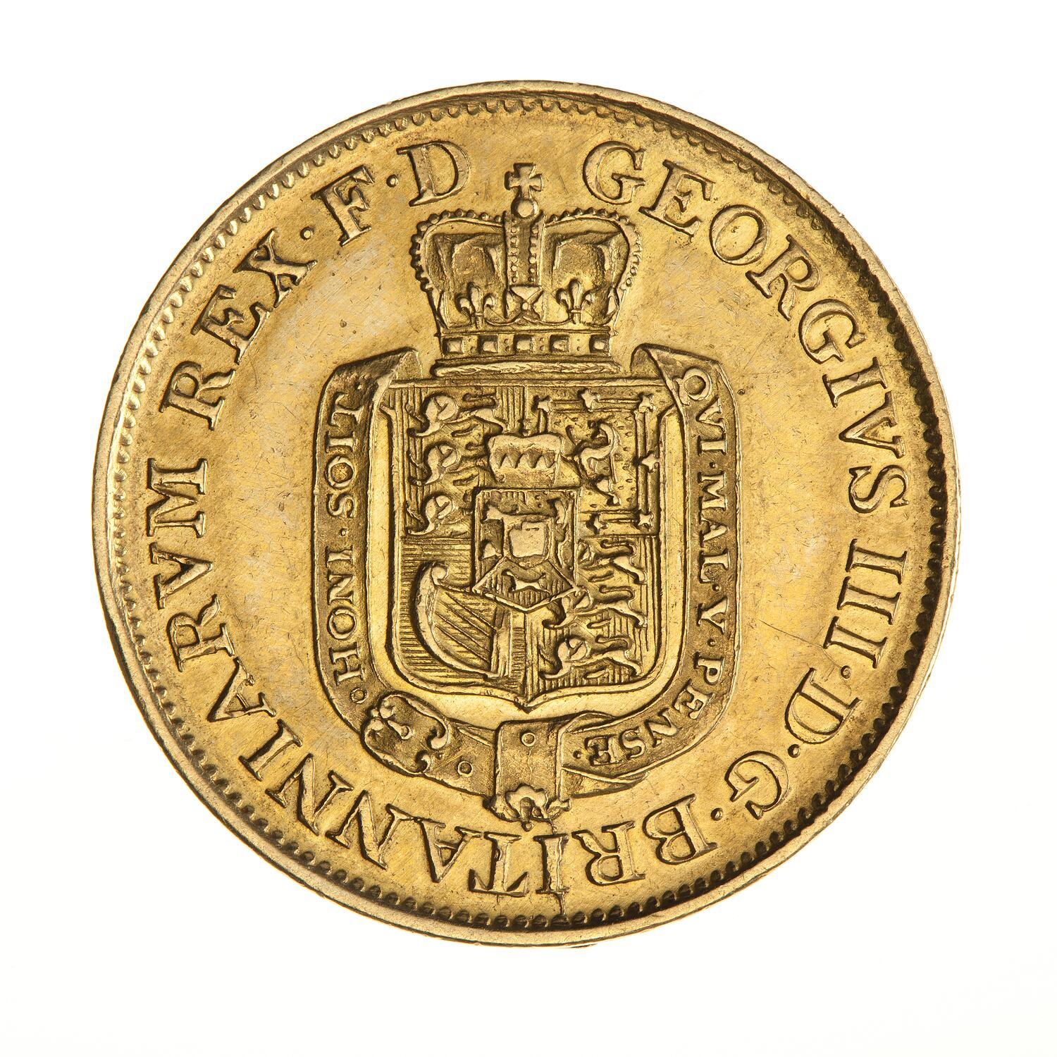 At centre, crowned shield of arms within the Garter; around, GEORGIVS III. D.G. BRITANNIARVM REX. F.D.