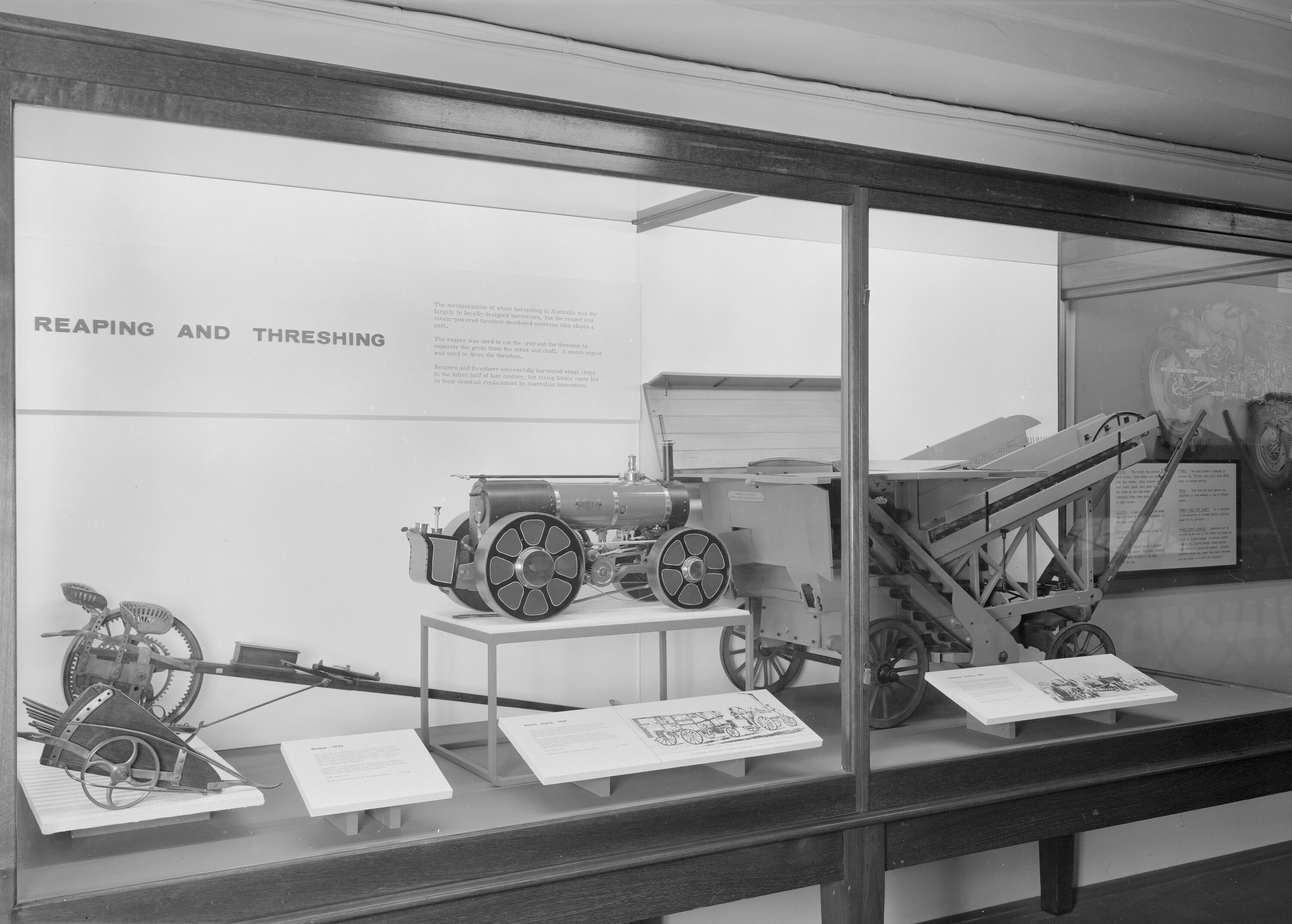'Reaping and Threshing' display, including Quinlivian 4WD steam traction engine model (centre), with models of reaping machines (left) and threshing machine (right), in a display case in Swinburne Hall.