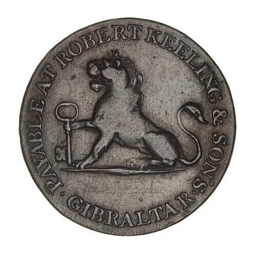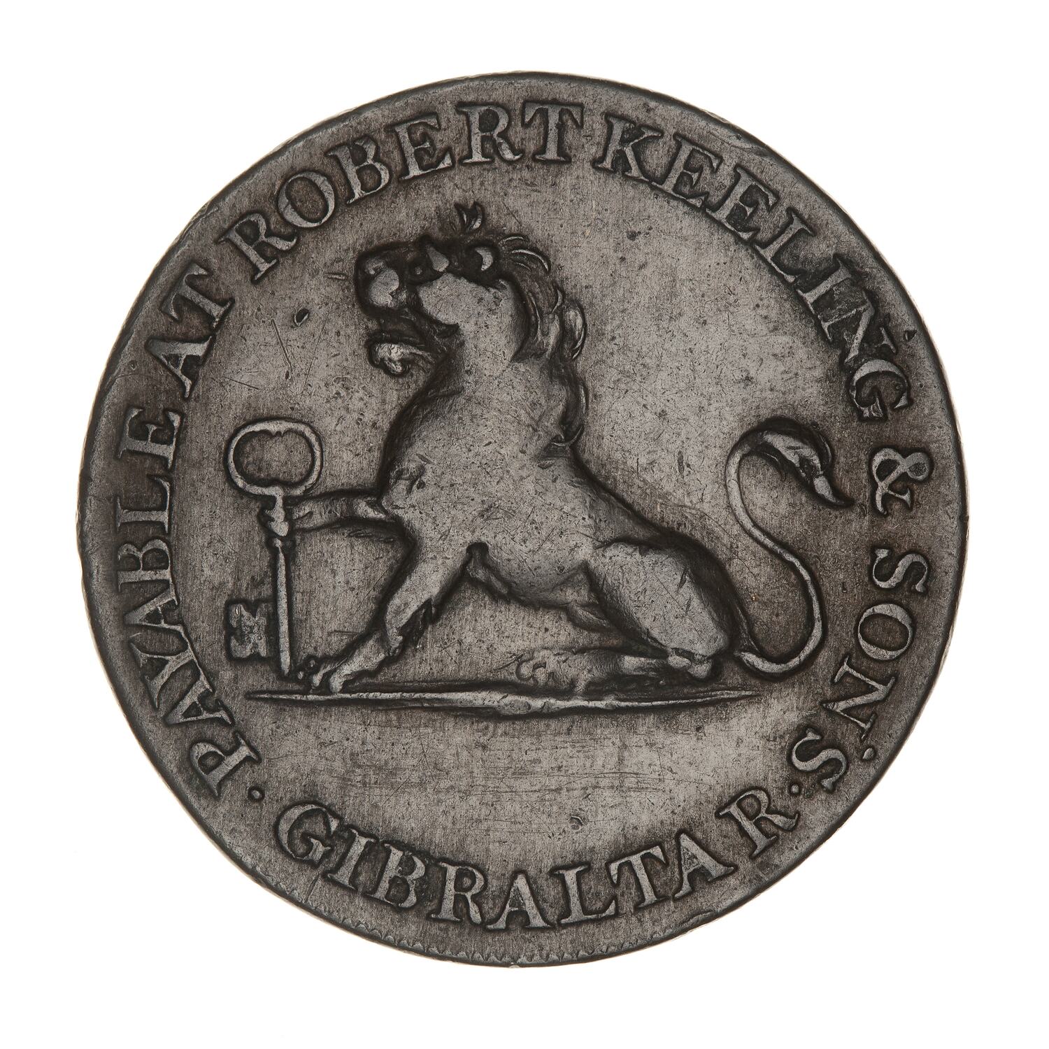 Lion seated facing left holding a key in its right paw; around above, PAYABLE AT ROBERT KEELING & SON'S; below, GIBRALTAR