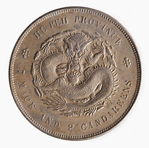 At centre, a dragon facing, curved around a pearl; around above, HU-PEI PROVINCE; around below, 7 MACE AND 2 CANDAREENS