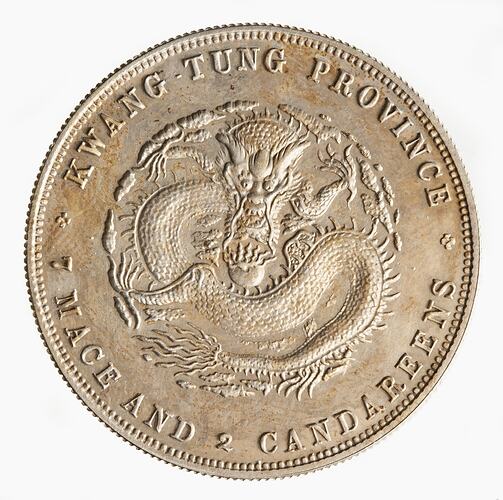 At centre, a dragon facing, curved around a pearl; around above, KWANG-TUNG PROVINCE; around below, 7 MACE AND 2 CANDAREENS