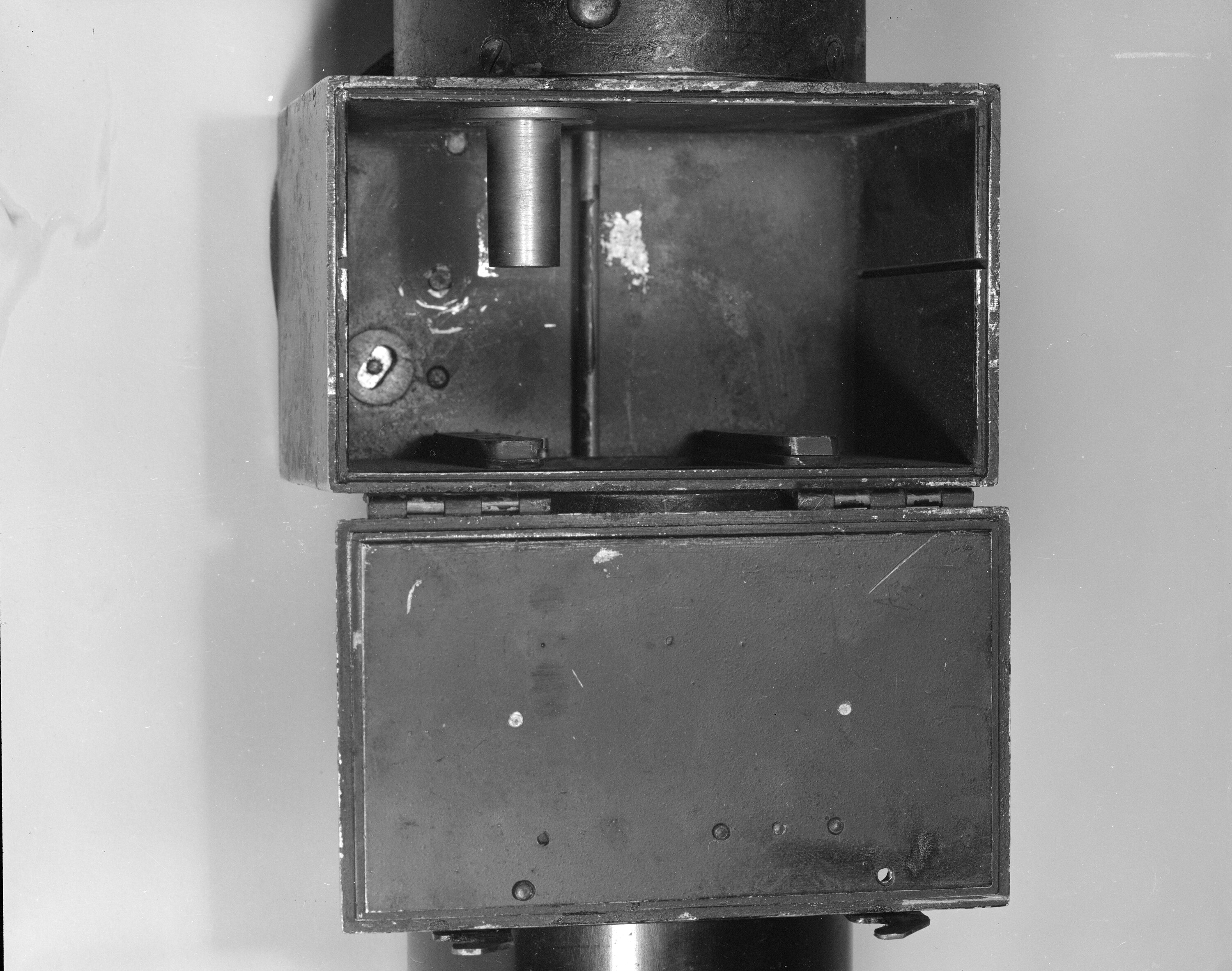 Photographic negative depicting the gun camera as part of the photography technology display at the Science Museum in the 1970s.