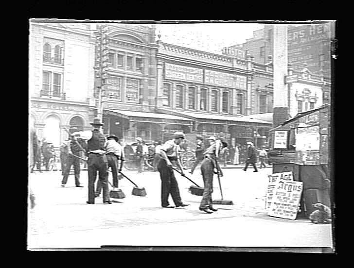 Men sweeping a wide street with brooms. All wear caps. Shop fronts visible beyond them. To their right, a newstand has signboards for The Age and Argus newspapers. A carriage is partly visible on the other side of the street. A dog is partly visible on the lower right of the image.