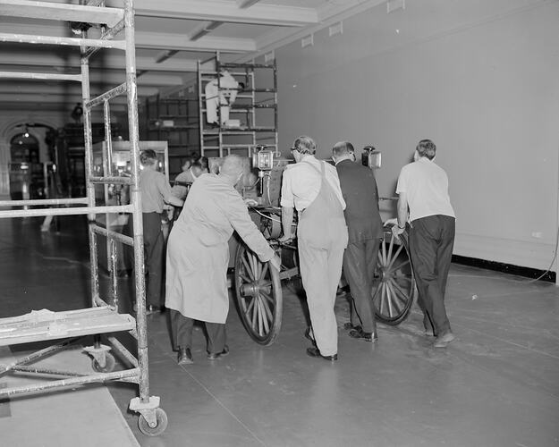 Copy of photograph negative showing the relocation of the Thomson Steam Car (ST 24990) at the Science Museum in 1970. Initially housed in the South Rotunda, the Thomson Steam Car was moved to Verdon Hall to join the rest of the Museum's transport displays.