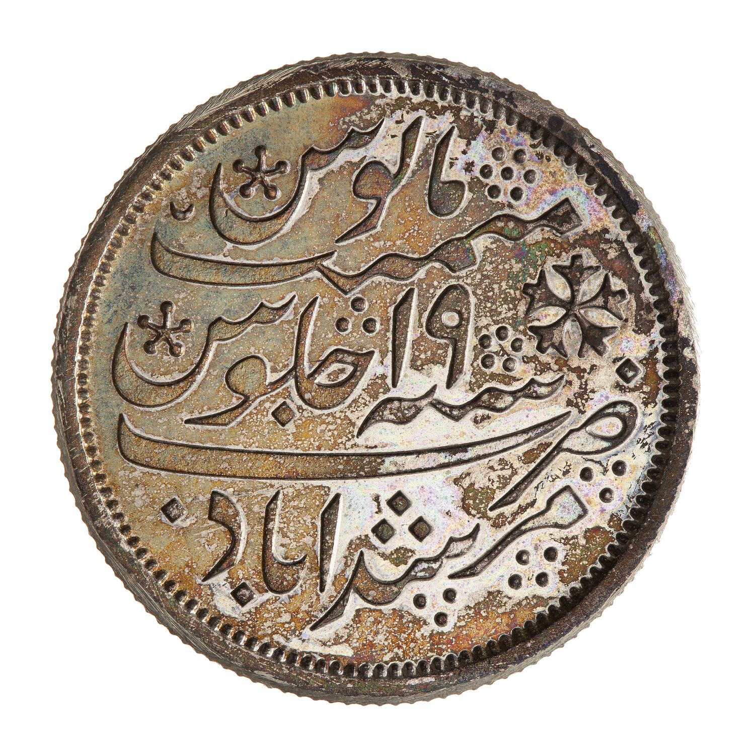 Persian Julus formular (Pridmore 13) (translation: Struck at the mint of Murshidabad in year 19 of his reign of tranquil prosperity) like the working strikes, this proof has a crescent on the reverse near the rim at 10 o'clock