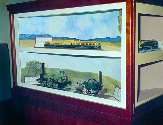 Copy of photograph negative of a diorama depicting a diesel and a long boiler locomotive at the Institute of Applied Science, circa 1960s.