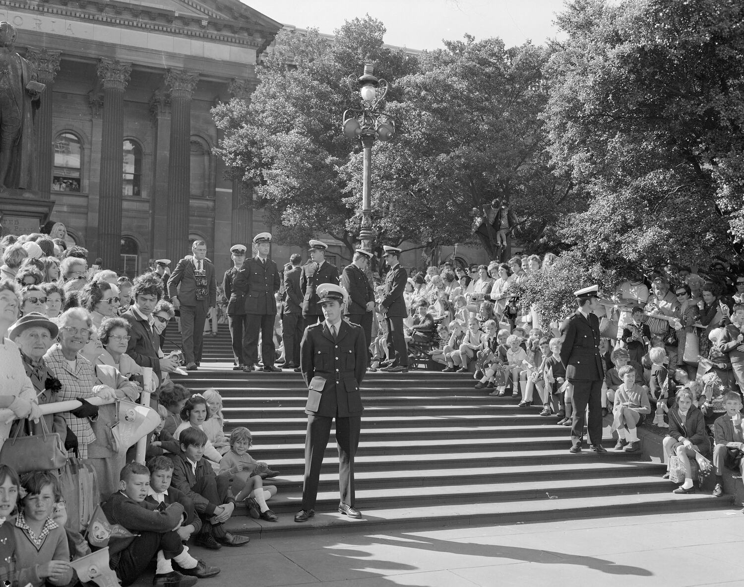 Photographic negative depicting crowd on the steps of the Swanston Street entrance to the Science Museum of Victoria during the Royal visit, 1970. The Royal Tour coincided with the Science Museum's centenary celebrations and special exhibition, which featured highlights of the Museum's collection.