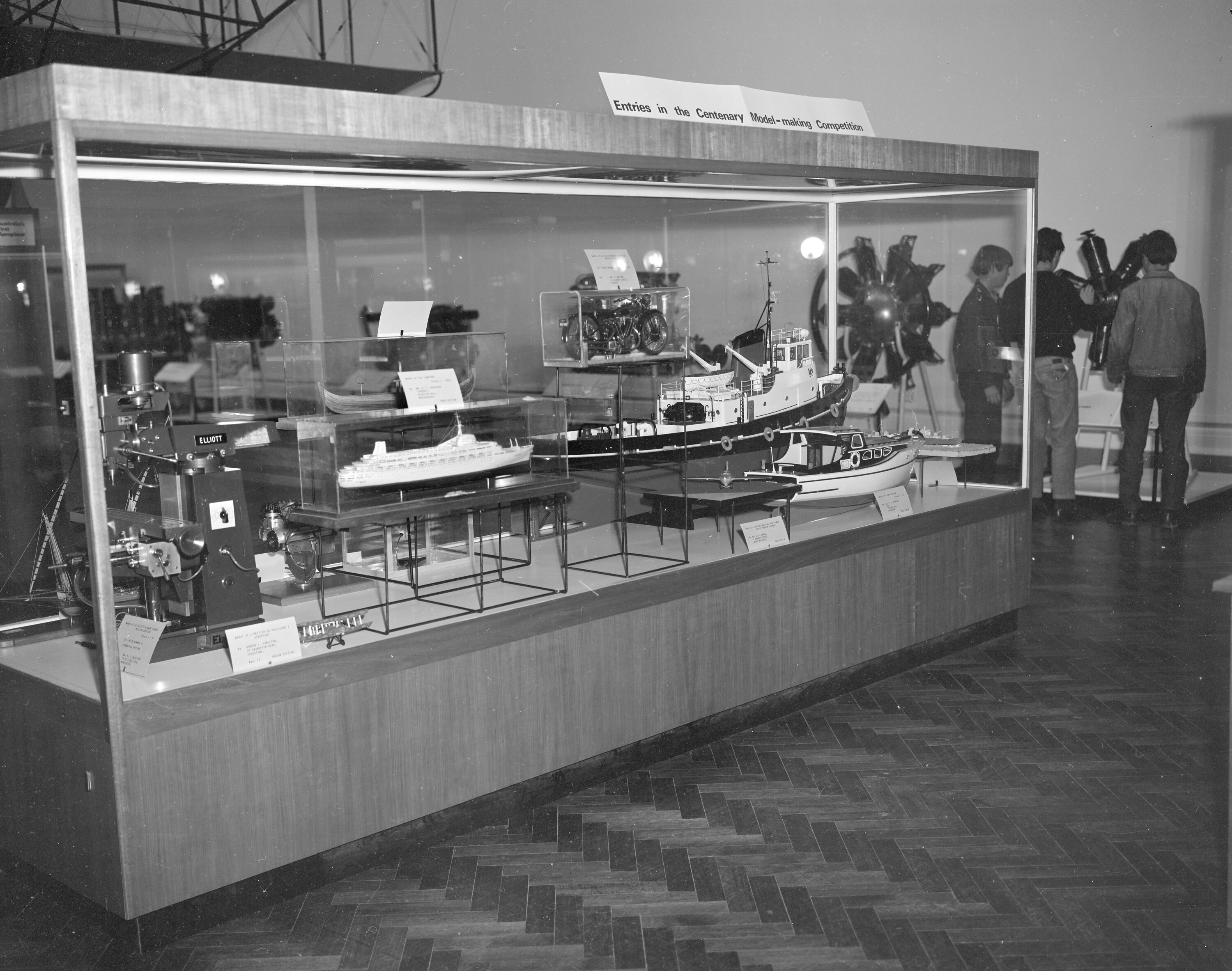 Negative copy of photograph showing entries for the Institute's model making competition, displayed in McArthur Hall. The Institute of Applied Science (Science Museum) celebrated its centenary in 1970.