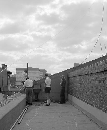 Copy of photograph negative depicting workers installing the radio broadcasting antenna on the roof of the Science Museum, Swanston Street, on 23 Feb 1974.