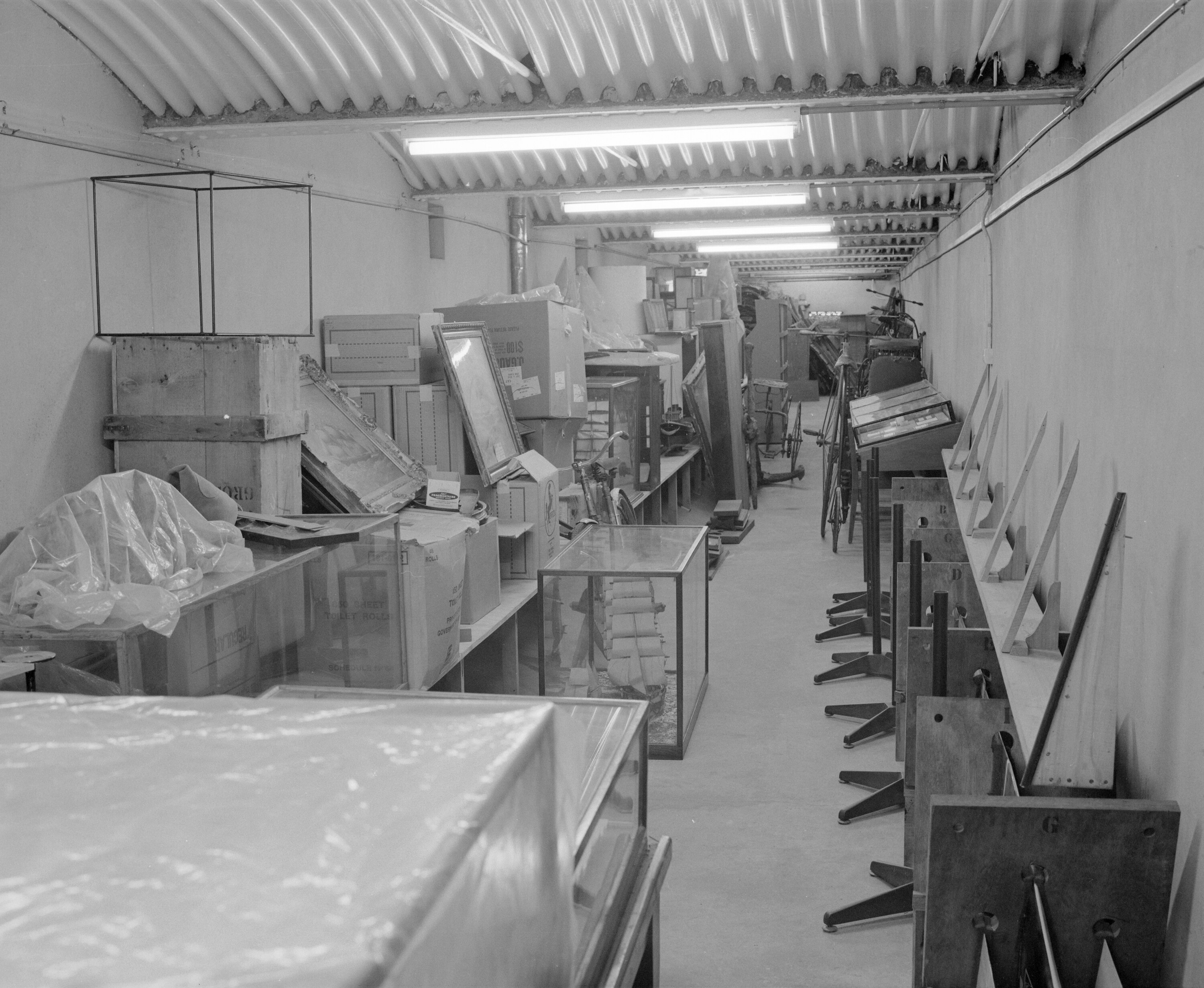 Photographic negative depicting storage area for the Science Museum, 1974.
