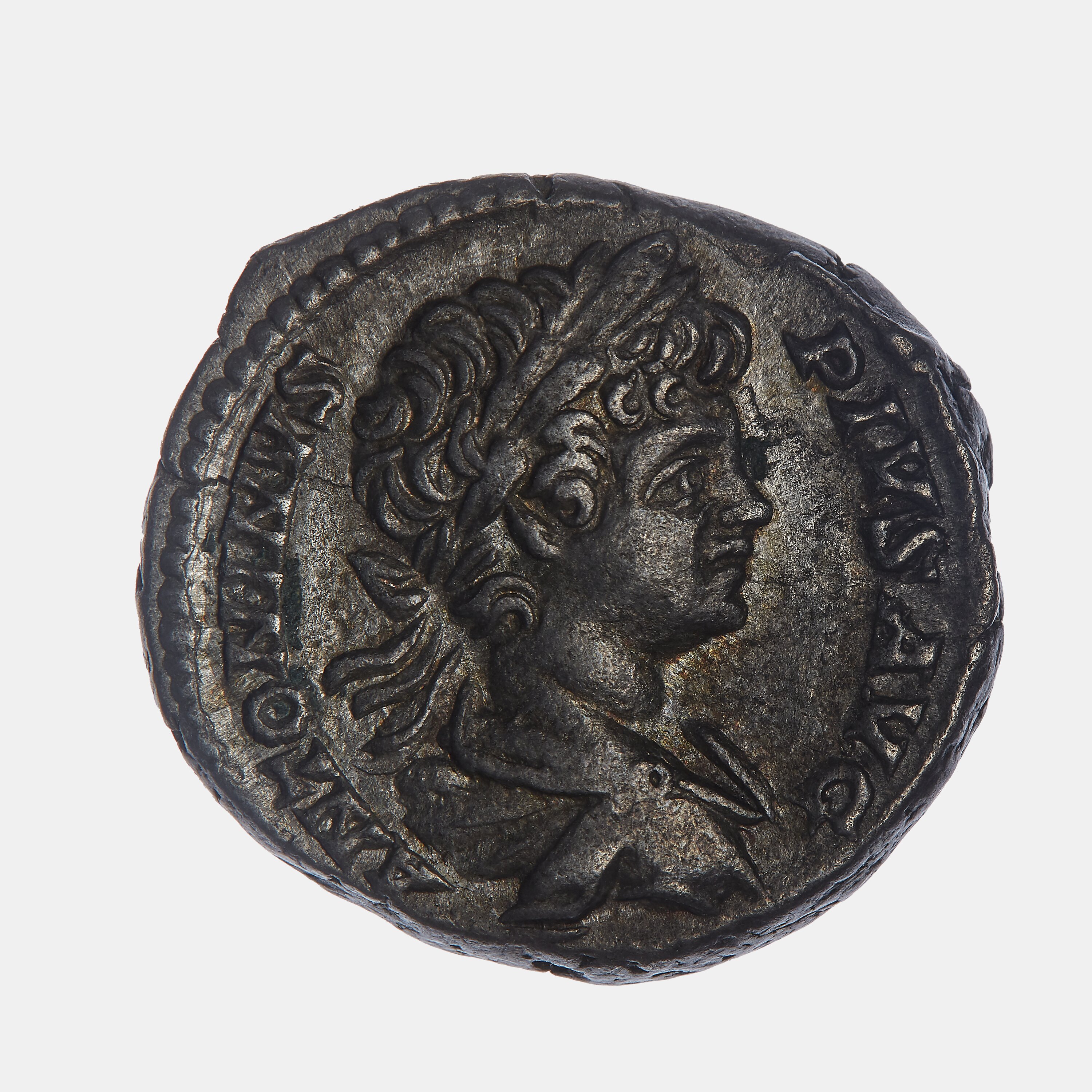 Silver Denarius issued by Emperor Caracalla in 201 AD. Caracalla became emperor as a 10 year old and is depicted on this coin as a child.