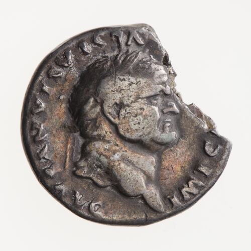 Silver denarius of the Emperor Vespasian struck in 75 AD, Ancient Roman Empire. Minted by Rome. The obverse legend found on this coin was introduced in 75 AD with Vespasian's holding the consulship for the sixth time and the reverse is only recorded with this obverse form bearing COS VI. The coin is badly broken with the missing part not in the collection.