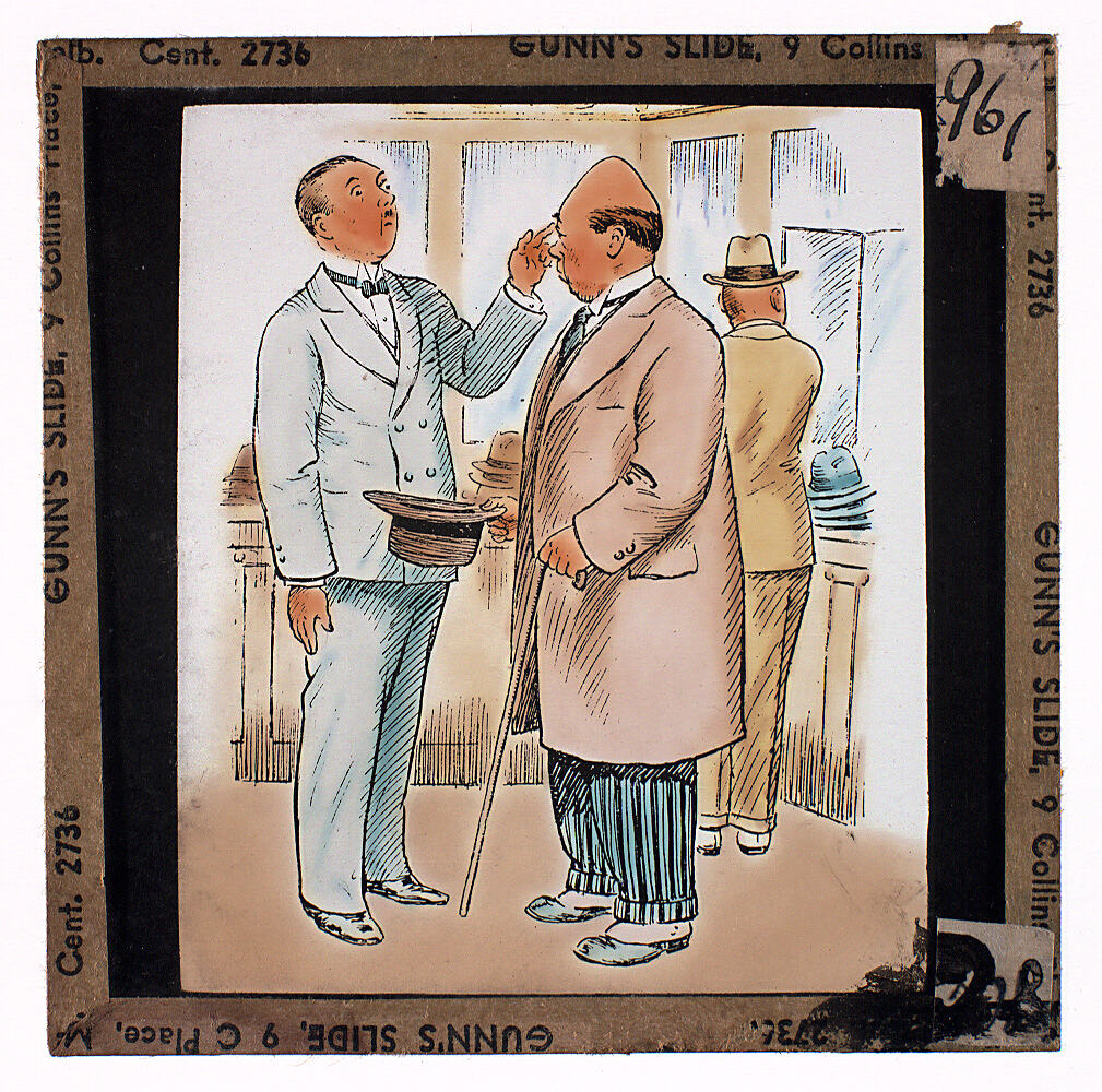 Colour glass lantern slide of a cartoon sketch of men in a hat shop, with the salesman surprised at the customer's head shape. Made by Alex. Gunn & Sons, Melbourne, Victoria, circa 1930s.