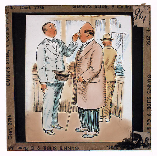 Text, on slide: GUNNS SLIDE, 9 Collins Place, Melb. Cent. 2736. Text on attached label: '961'.