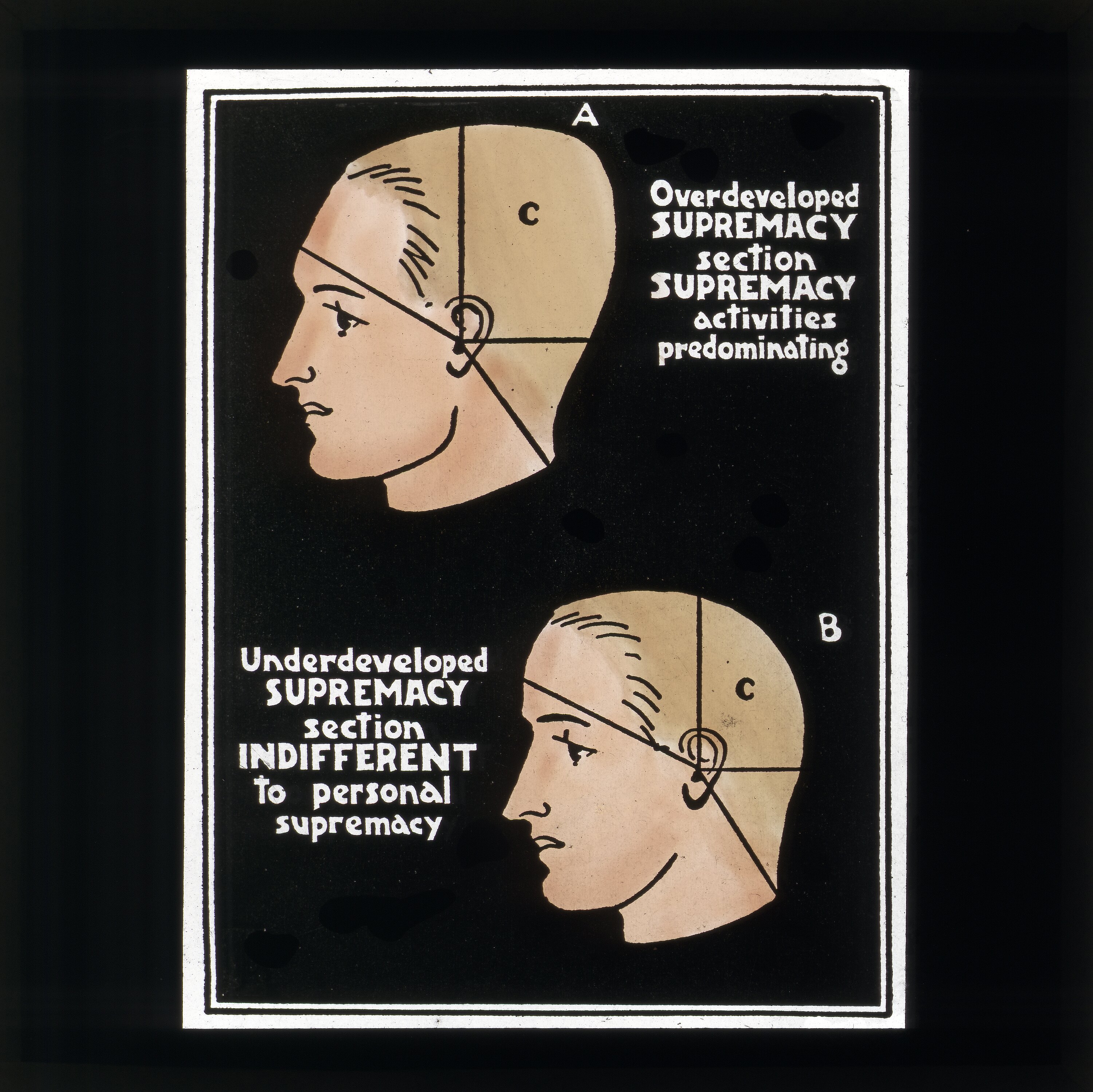 Sketch of two heads in profile and divided into sections with the words 'Overdeveloped supremacy section supremacy activities predominating' written next to the first head and 'Underdeveloped supremacy section indifferent to personal supremacy' written on the second.